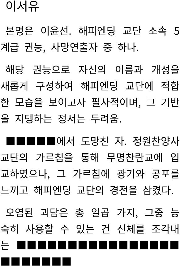 هُو يو-وون الذي أراد فرض حظر على المسؤولين واستخراج المعلومات منهم كدمى، ومسؤولي طائفة النهاية السعيدة الذين أرادا غمرنا بالنبيذ.