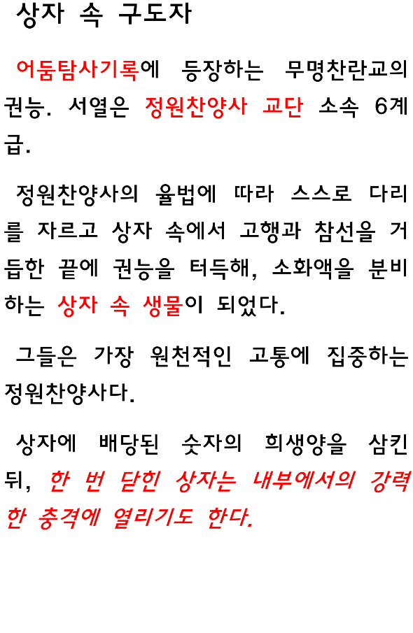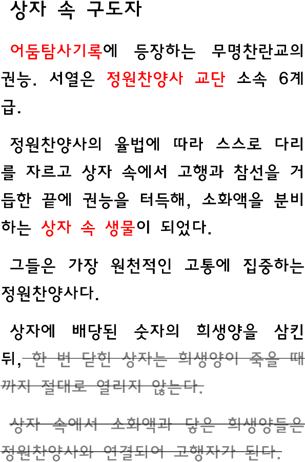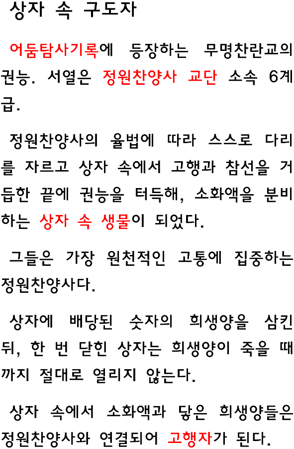 لقد اكتسبوا القوة بعد أن بتروا أرجلهم بأنفسهم، وكرروا التأمل والمعاناة داخل صندوق وفقًا لقانون "مُمجدوا العدد المحدد"، ليتحولوا إلى كائن في صندوق يفرز عصارة هاضمة.