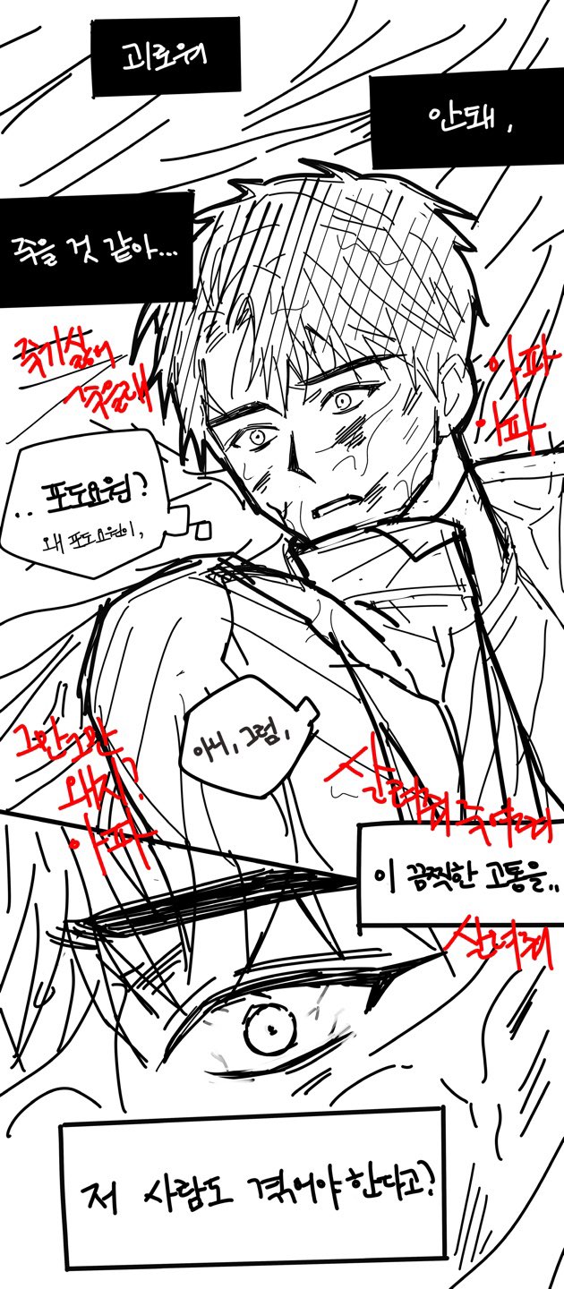 –لا أريد أن أموت، هل سأموت؟ لا أريد أن أموت، هل سأموت؟ لا أريد أن أموت، توقف! توقف! توقف! لماذا؟ لماذا حدث هذا لي؟ هذا يؤلمني كثيرًا! يؤلمني!! إيروم-نيم، لقد قمت بعمل قيّم! إنه مؤلم! لقد قمت بعمل قيّم! أنقذني، اقتلني، أنقذني، اقتلني.