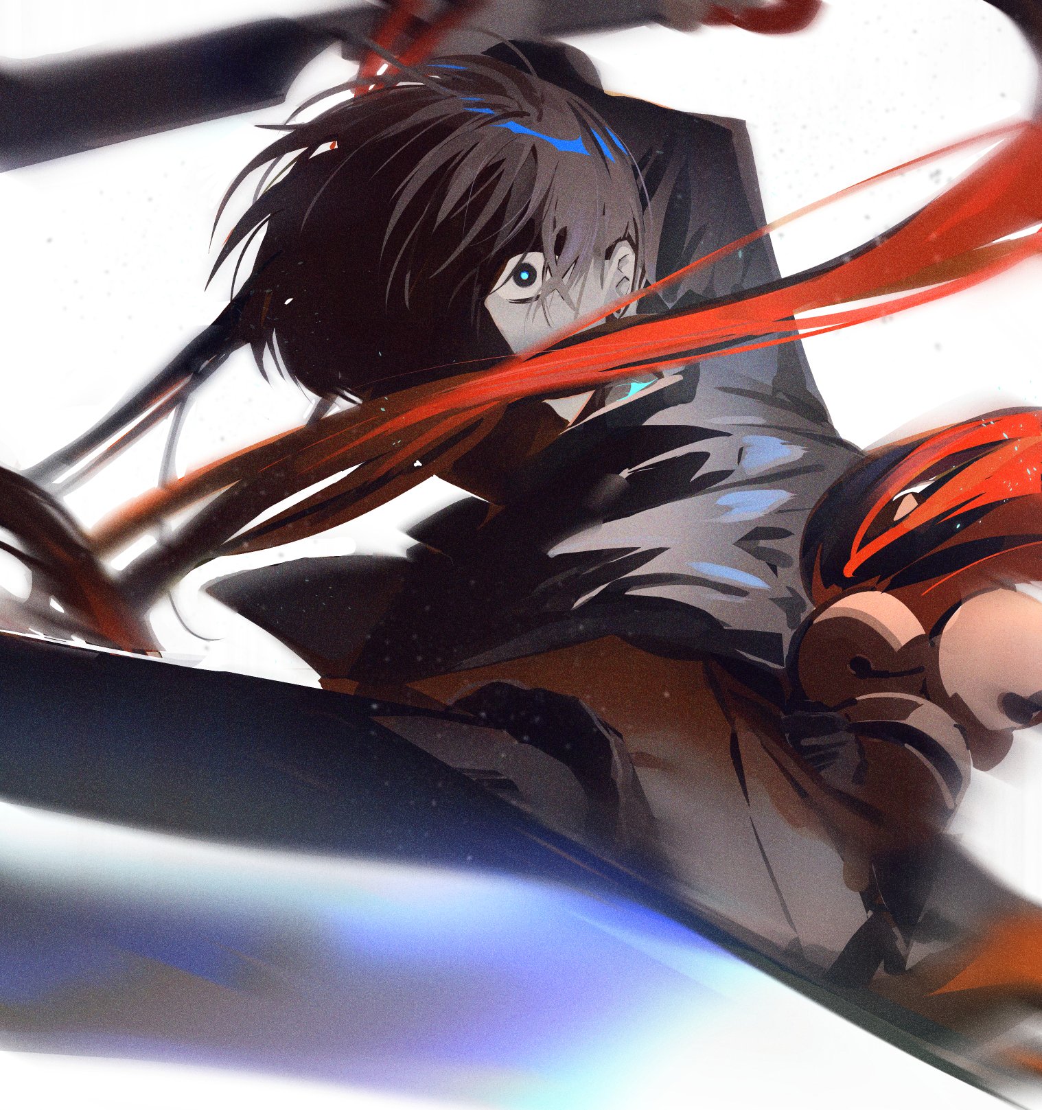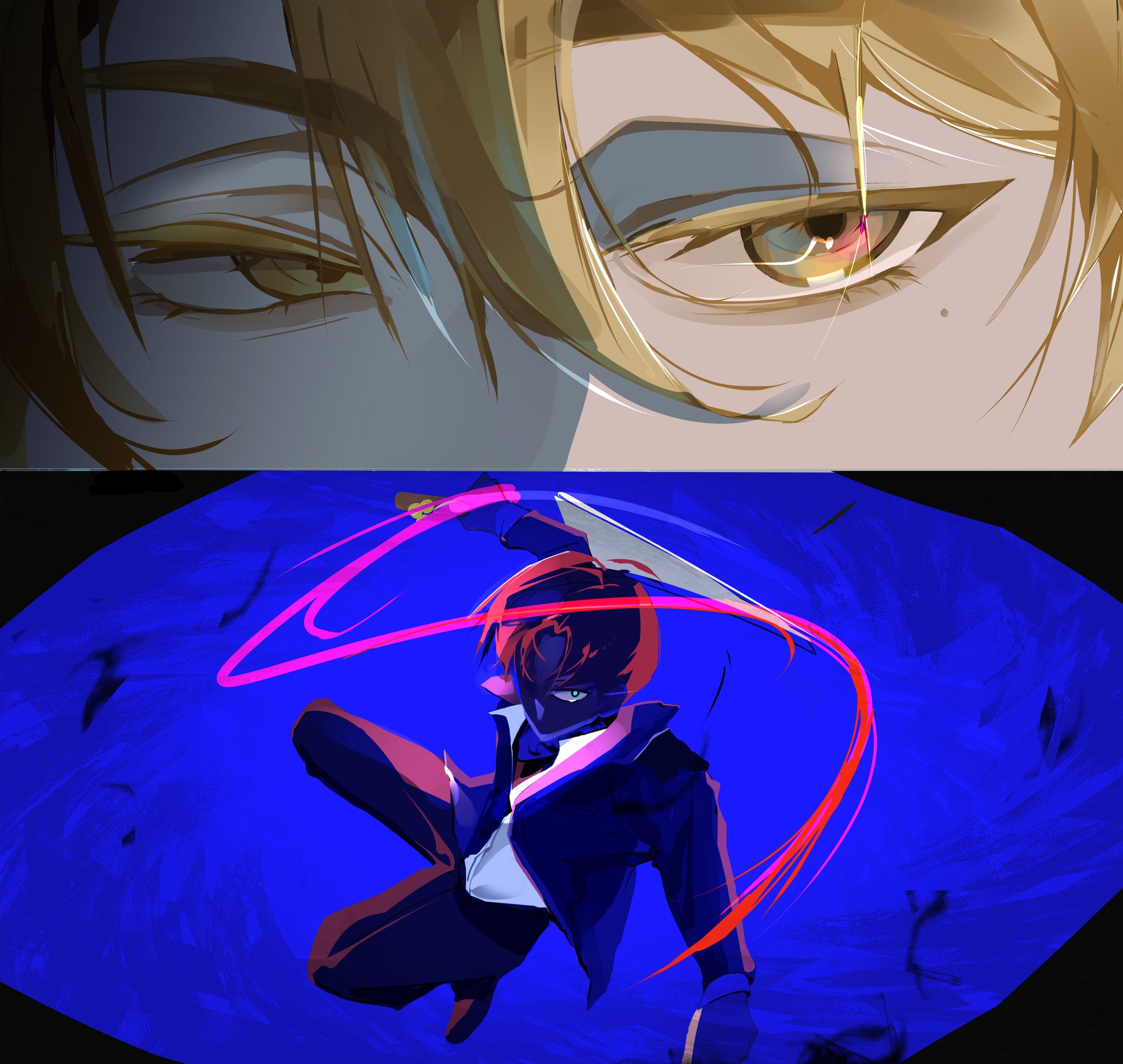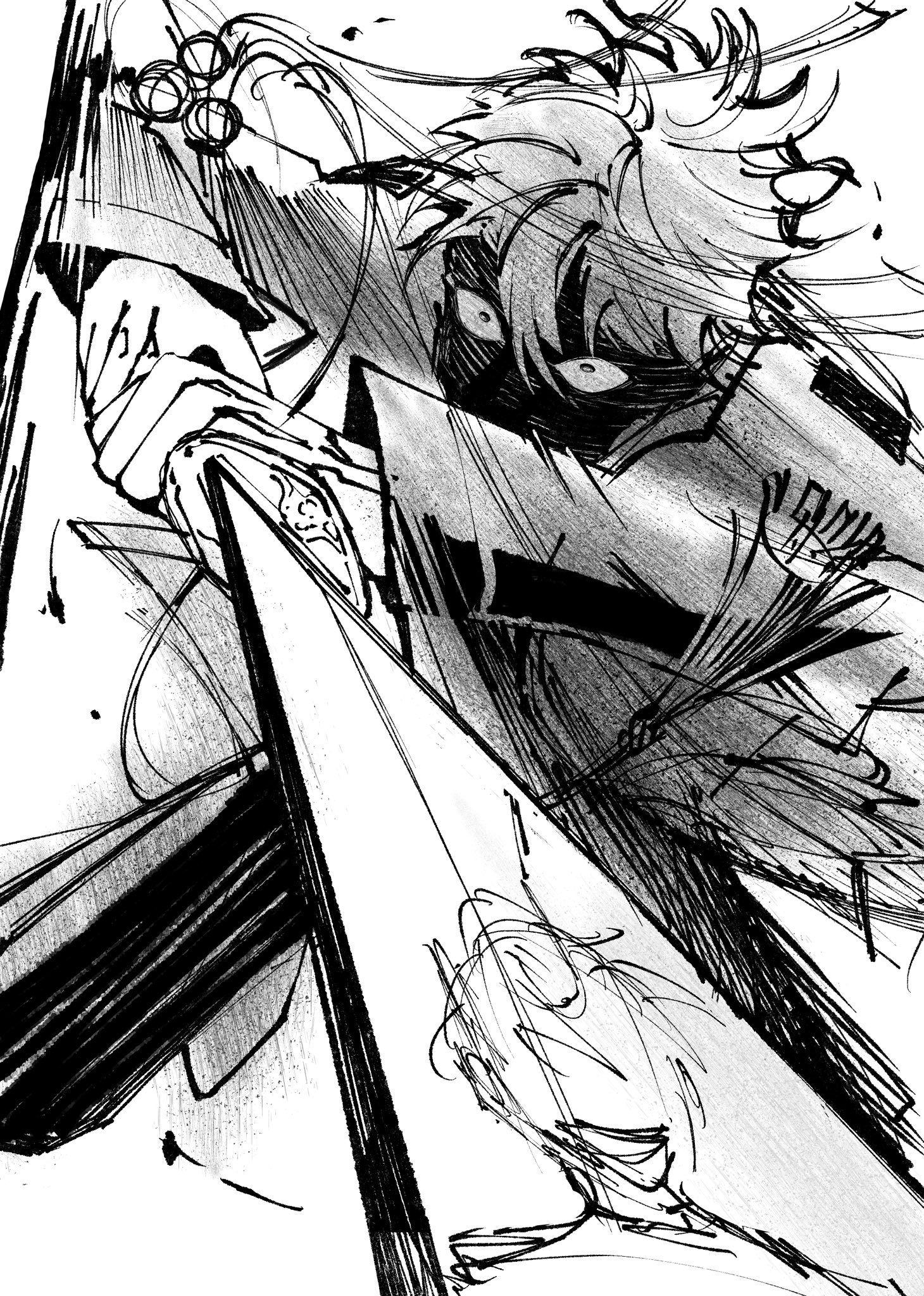 شاهد شفرتين ضخمتين زرقاوتين من شفرات كالنصل تتراقصان في الهواء، تحملهما ذراع إنسان، وتتحركان بحيوية.