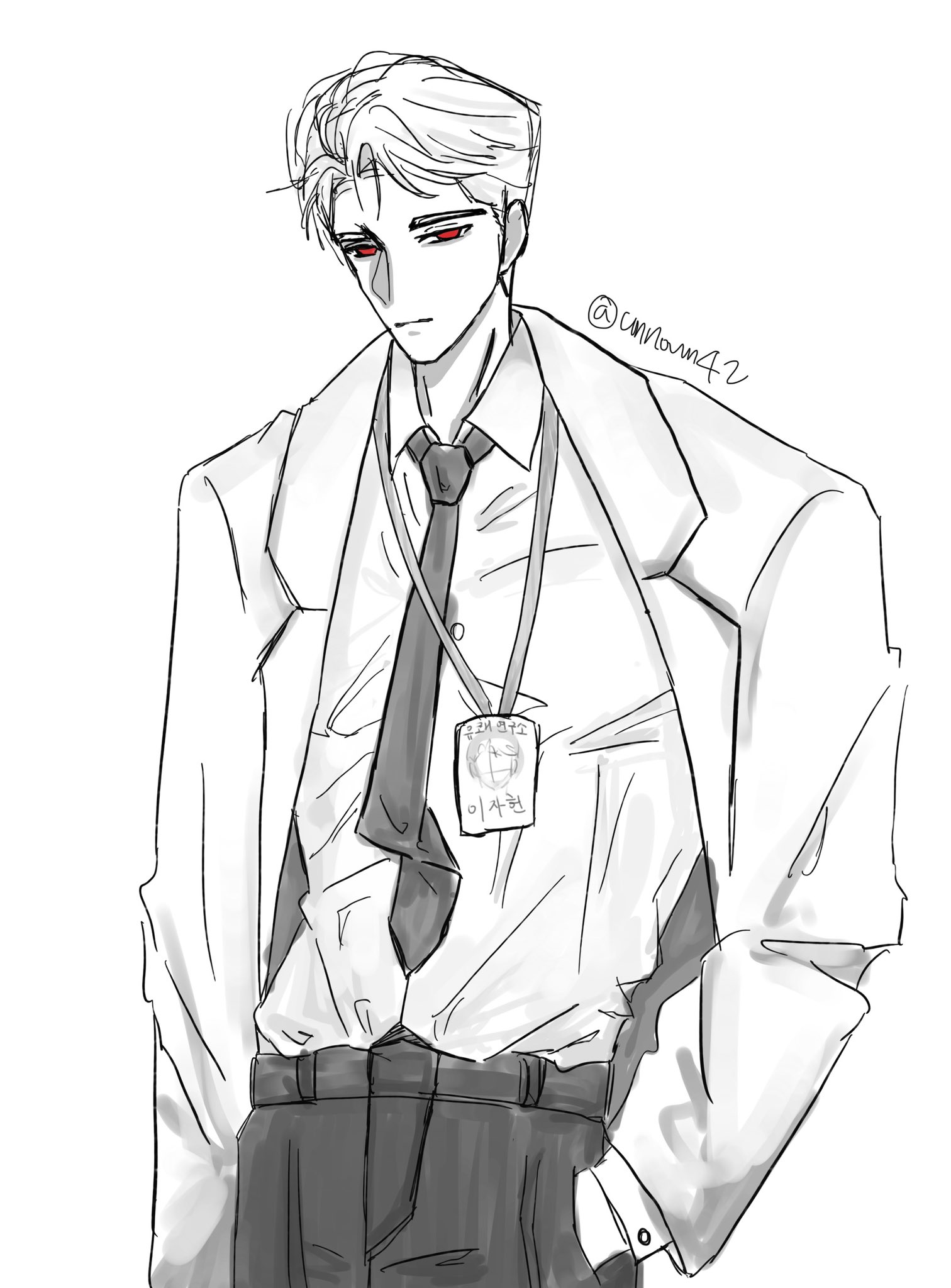 نظرت بعينين مرتعشتين إلى معطف المختبر الخاص بالشخص مرة أخرى.