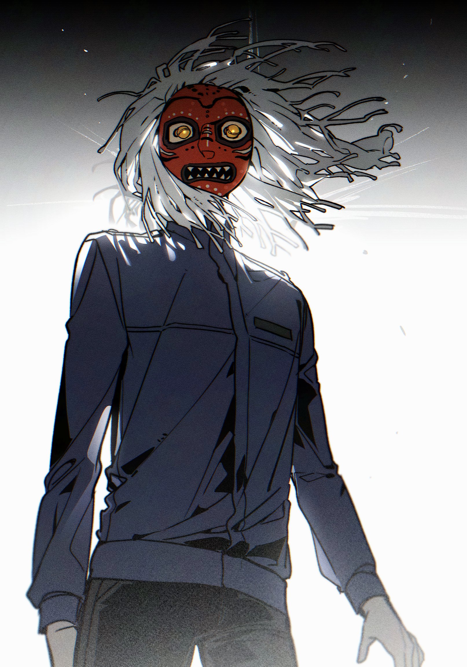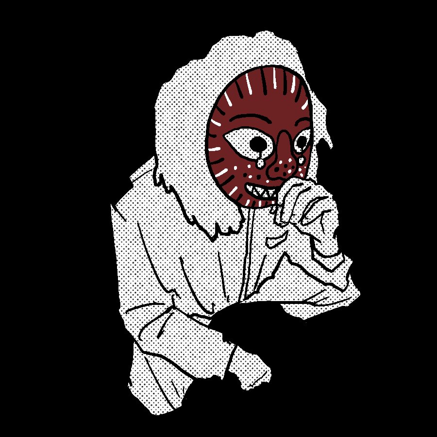 بدا وكأن القناع على وشك أن يفتح فكه المدبب الذي تتدلى منه أسنان متناثرة في أي لحظة.
