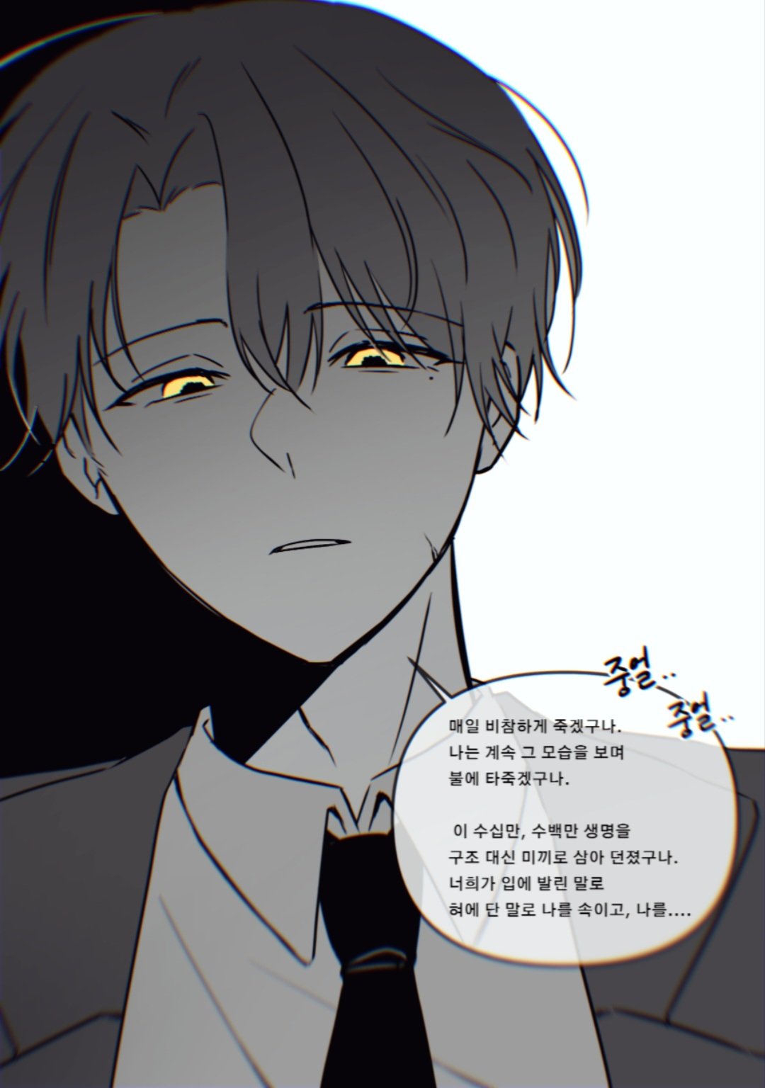 ~سأستمر في الموت بشكل مأساوي كل يوم. سأستمر في مشاهدة ذلك وأنا أحترق حتى الموت. لقد ضحّيتم بعشرات الآلاف، بل مئات الآلاف، من الأرواح كطعم يُلقى بدلاً من إنقاذهم. لقد خدعتموني بلسانكم المعسول، وبكلماتكم المنمقة الفارغة، خدعتموني...