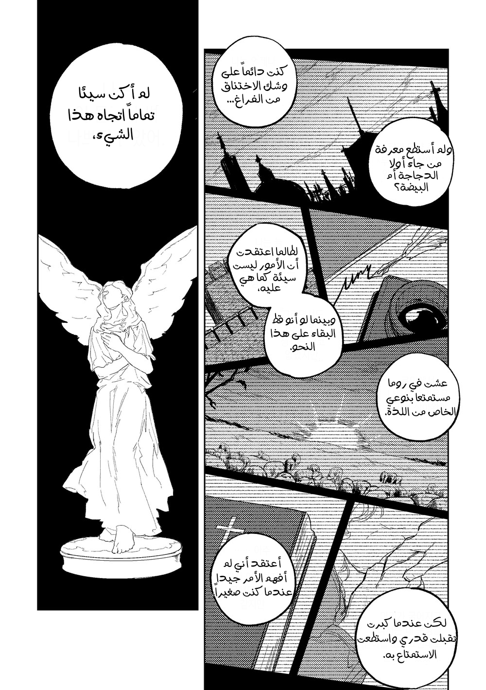 "لم أكن سيئاً تماماً تجاه هذا الشيء. كنتُ دائماً على وشك الاختناق من الفراغ... ولم أستطع معرفة أيهما جاء أولاً، الدجاجة أم البيضة. كنتُ أعتقد دائماً أن الأمور ليست سيئة كما هي عليه، وبينما لم أنوِ قط البقاء على هذا النحو، عشتُ في روما مستمتعاً بنوعي الخاص من اللذة. كنتُ أعلم أن هناك من يسعون لإيذائي أو يضمرون نوايا سيئة، لكنني كنتُ أكتفي بوضع ذقني على يدي والتأمل، واجداً بعض التسلية في ذلك، دون معاقبتهم. قبلتُ المسؤوليات الثقيلة الموكلة إليّ في الواقع، كما لو لم تكن بثقل حبات الرمل التي تذروها رياح القرون المبعثرة لأعمدة 'تشيبولينو' في هذا المعبد. أعتقد أنني لم أفهم الأمر للحظة عندما كنتُ صغيراً جداً، ولكن بمجرد أن كبرتُ، قبلتُ قدري واستطعتُ الاستمتاع به."