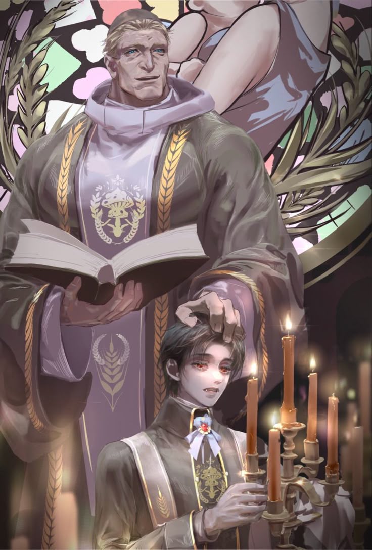بعد اجتياز الباب، فحص ليونارد المنطقة وأدرك أنها قد كانت فارغة. لم يكن هناك سوى شخصين. كان أحدهم جالسًا في المقعد الأمامي، يركز على الصلاة. والثاني هو الرجل الوسيم الذي كان يرتدي ثياب الكهنة. كان لديه شعر أسود وعيون حمراء.