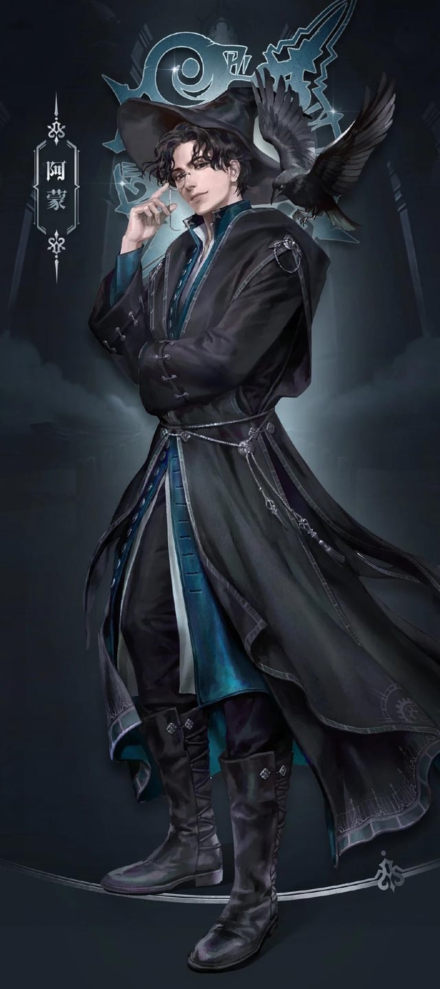 وكان يرتدي رداء أسود كلاسيكي وقبعة مدببة من نفس اللون. لقد تغير من كونه رجل نبيل من العصر الحالي إلى ساحر قديم نشأ من الحقبة الرابعة أو حتى الحقبة الثالثة.