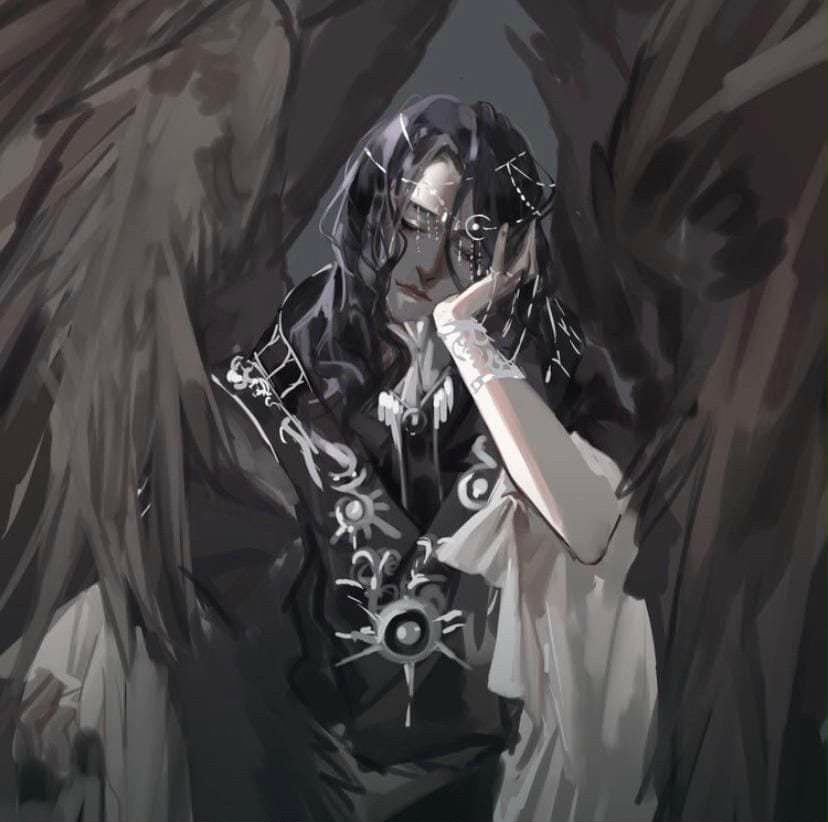 كان يجلس على العرش رجل بشعر أسود مجعد قليلاً وصل إلى كتفيه. كانت عيناه مغطيتان بالظلال، وكان مظهره الفعلي ضبابيًا للغاية، مما منع الآخرين من رؤيته بوضوح. سقطت طبقات وطبقات من الأجنحة السوداء من خلفه، وغطت معظم جسده. كان الرداء أسود مطرز بخيوط فضية. لقد شكلوا أنماطًا معقدة وكان به إكسسوارات رائعة معلقة عليه.