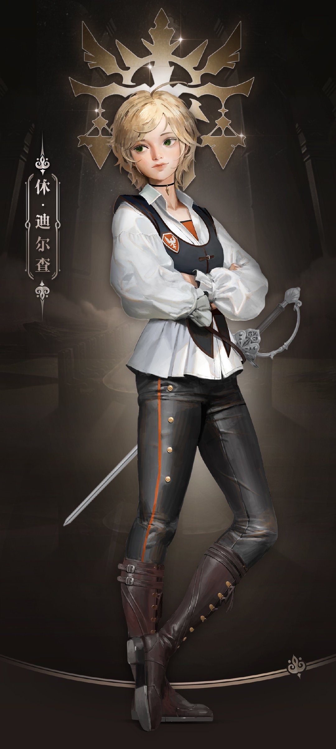على الرغم من أن شعرها الأشقر الذي كان بطول الكتف كان فوضويًا وغير مهذب، وكانت في بدلة تدريب تقليدية لفارس، إلا أنها حملت مظهرًا لا يوصف للكرامة وسحرًا مقنعًا.