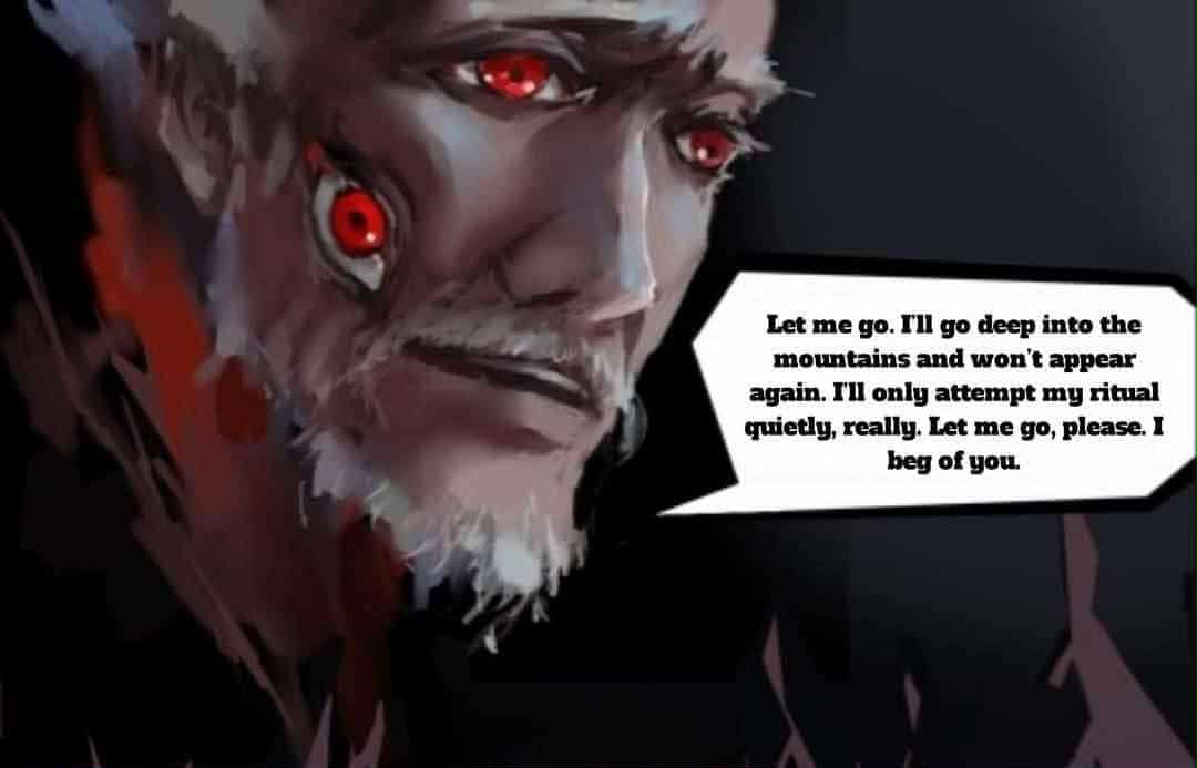 “يجب أن تكون قد سمعت عن ذلك. في ذلك الوقت، أخطأت أثناء السحر الشعائري لعلاج مرضها، لذلك فشلت. لقد فشلت في إنقاذها. أعرف الآن أن ذلك بسبب أنني لم أتقن فنون الغوامض بعد. الآن، لدي الآن ما يكفي من المعرفة والخبرة لإكمال كل شيء! من المؤسف أنني لم أستوحي من شعار باحث الغموض و دالي. فاتتني أفضل فرصة. إذا كنت من ذوي التسلسل العالي، كل هذا سيصبح سهل للغاية “. وبينما كان يتحدث، بدا صوت العجوز نيل يبكي: “لا، لا يمكنني أن أستسلم مرة أخرى… دون، ارجع. ارجع، أرجوك. أنا أتوسل إليك”.