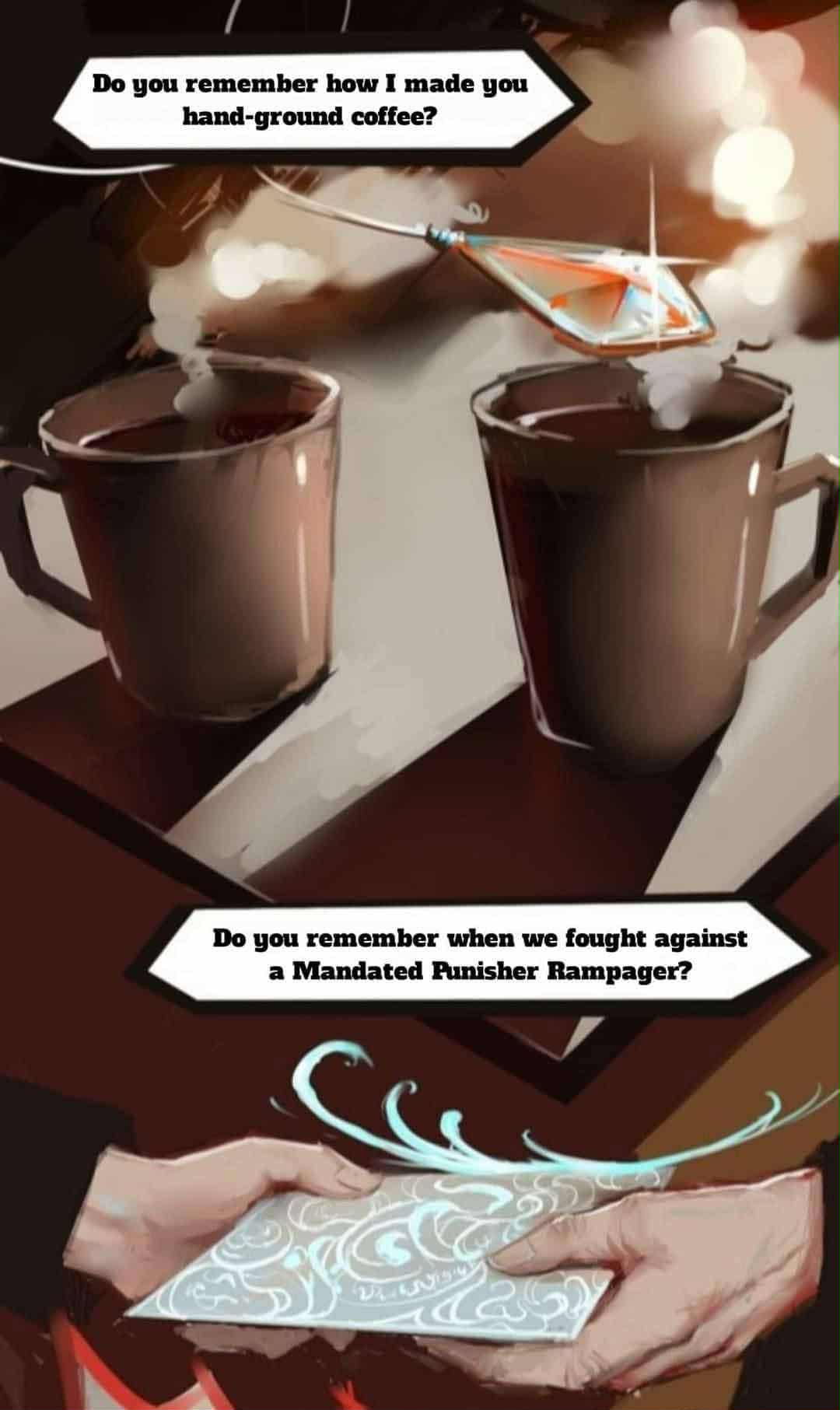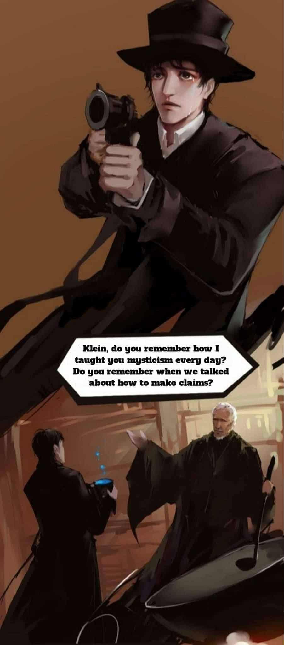 “كلاين، هل تتذكر كيف علمتك الغوامض كل يوم؟ هل تتذكر عندما تحدثنا عن كيفية تقديم مطالبات بالتعويض؟ هل تتذكر كيف صنعت لك القهوة المطحونة يدويًا؟ هل تتذكر عندما قاتلنا ضد المكلف بالعقاب الهائج؟ “