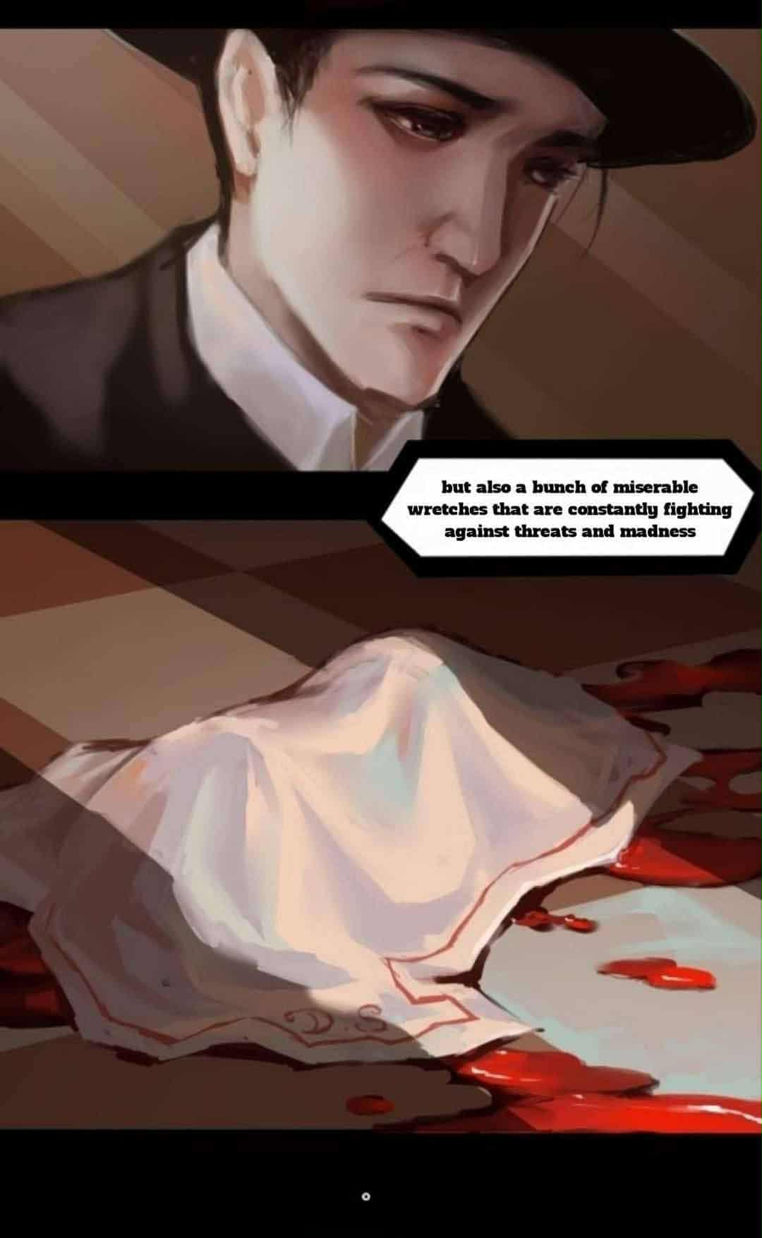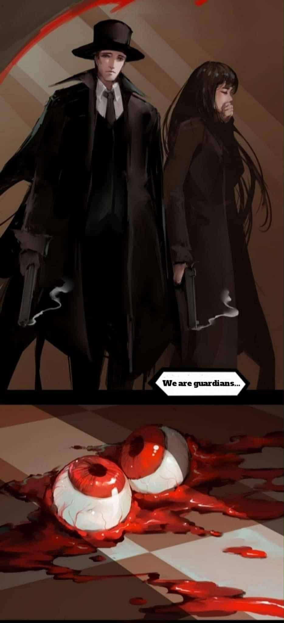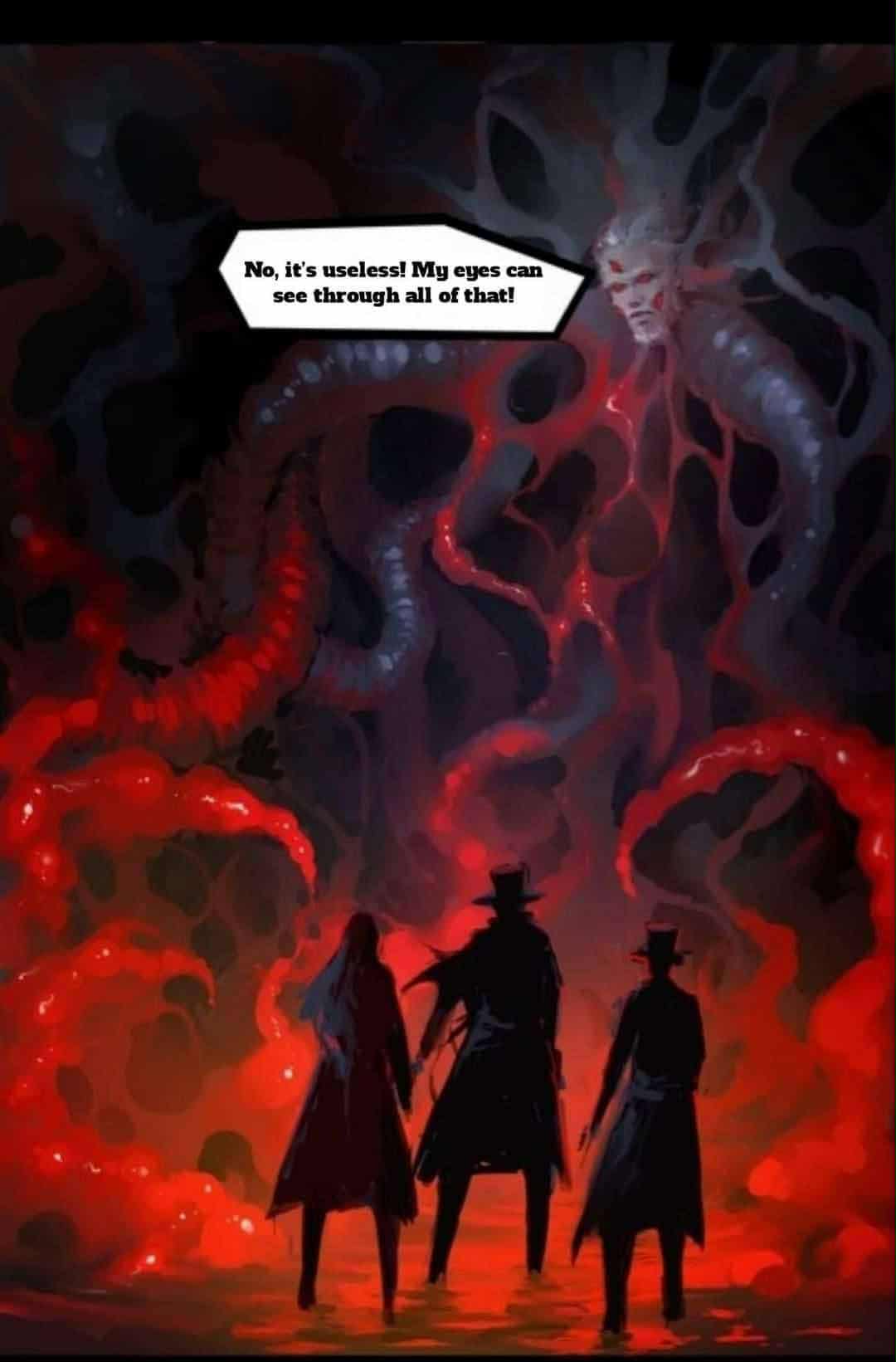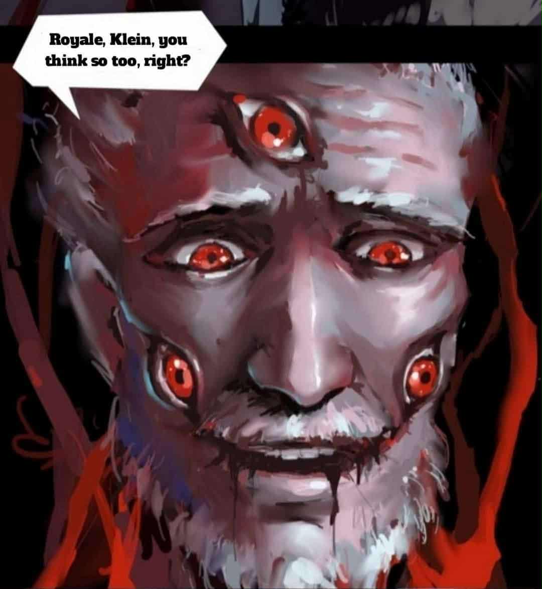 بدأ الدم اللزج الذي غطى السقف والأرضية والجدران بالهبوط، مثل عملاق يفتح فمه لابتلاع كلاين وشركائه. أصبح رأس العجوز نيل ضبابيًا مثل الصور المتداخلة.