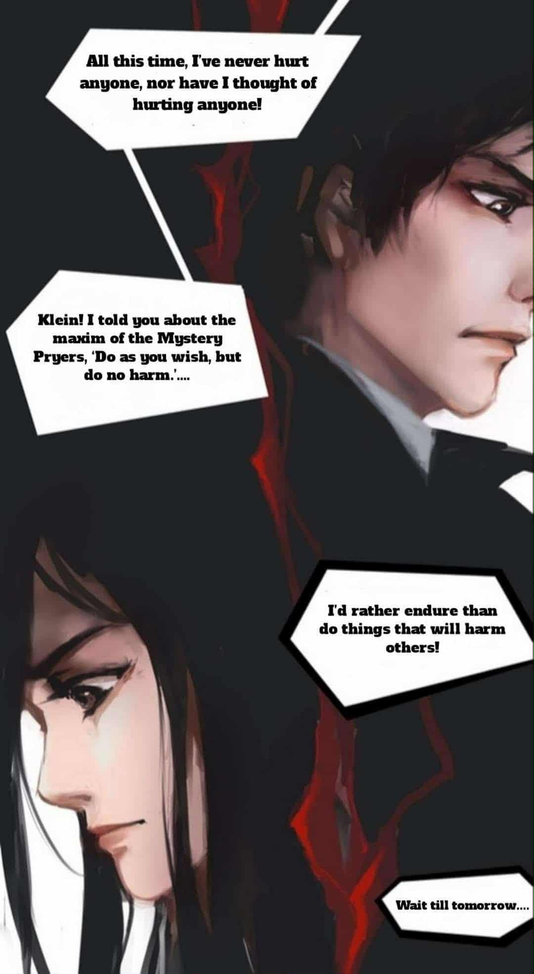 “كلاين!” صرخ فجأة كما يفعل عادةٍ. “لقد أخبرتك عن مبدأ باحث الغموض ،” افعل كما تريد، ولكن لا تضر. ” ما زلت أعيش بهذا القول. أفضل أن أكون صبوراً . أفضل أن أتحمل بدلاً من القيام بأشياء تضر بالآخرين…”