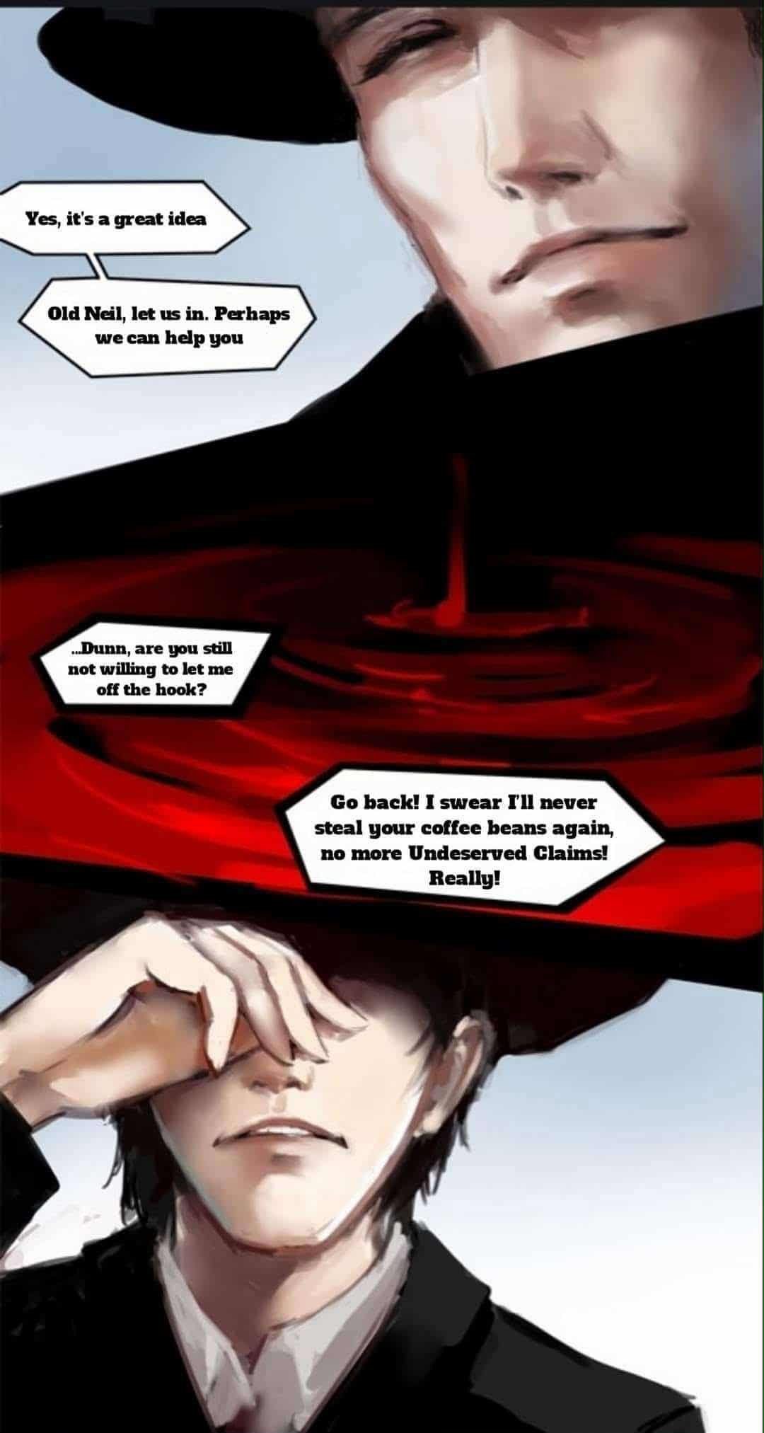 “…دون، هل ما زلت غير مستعد لمسامحتي؟” ناشد العجوز نيل، “عد، فقط عد. سأعود إلى طبيعتي غدًا، حقًا. دون، أقسم أنني لن أسرق أبدًا حبوب القهوة مرة أخرى. كلاين، رويال، أقسم أنني لن أجعلكما تساعدانني مع ادعاءاتي غير المستحقة! حقًا! “