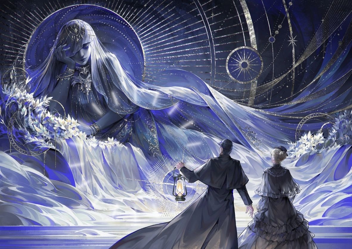 لقد كانت سيدة جميلة للغاية مع وجه ضبابي. دعمت يدها اليمنى رأسها وهي تستلقي على المنصة. كانت ترتدي ثوبًا كلاسيكيًا أسود الطبقات لم يكن معقدًا للغاية. كانت هناك دائرة من الأشعة المشعة في الجزء السفلي من رأسها.