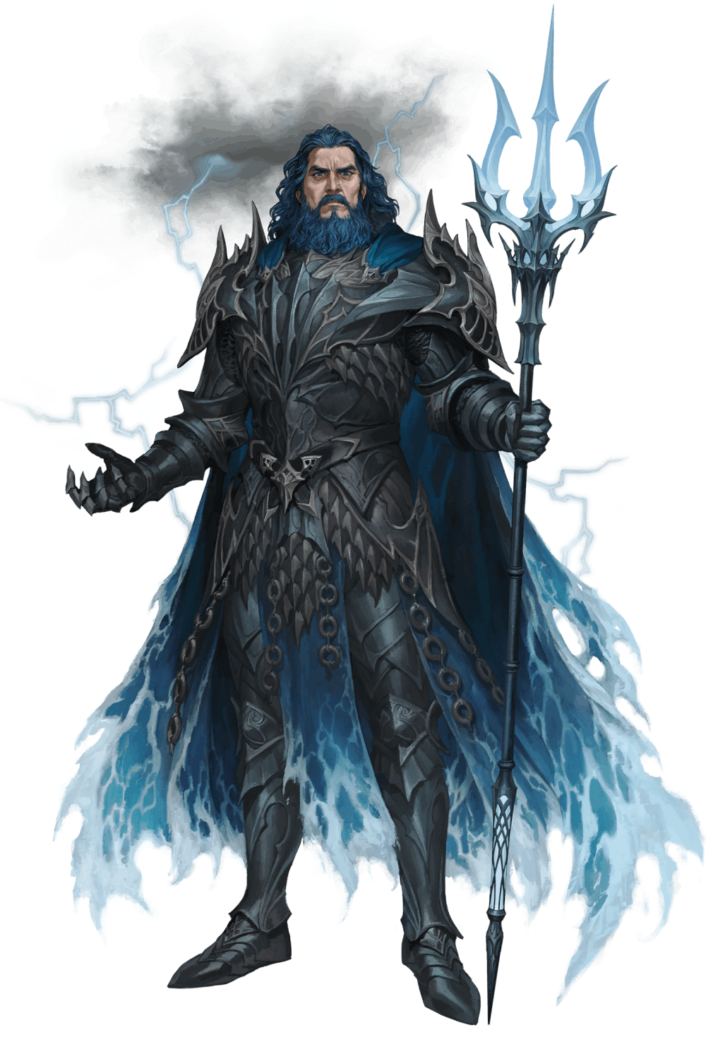 رجل مهيب في منتصف العمر يرتدي درعًا أسود، يقف فوق موجات متعرجة، محاط بالرياح العاصفة، مع وميض البرق خلفه و ورمح ثلاثي الشفرات في يده.