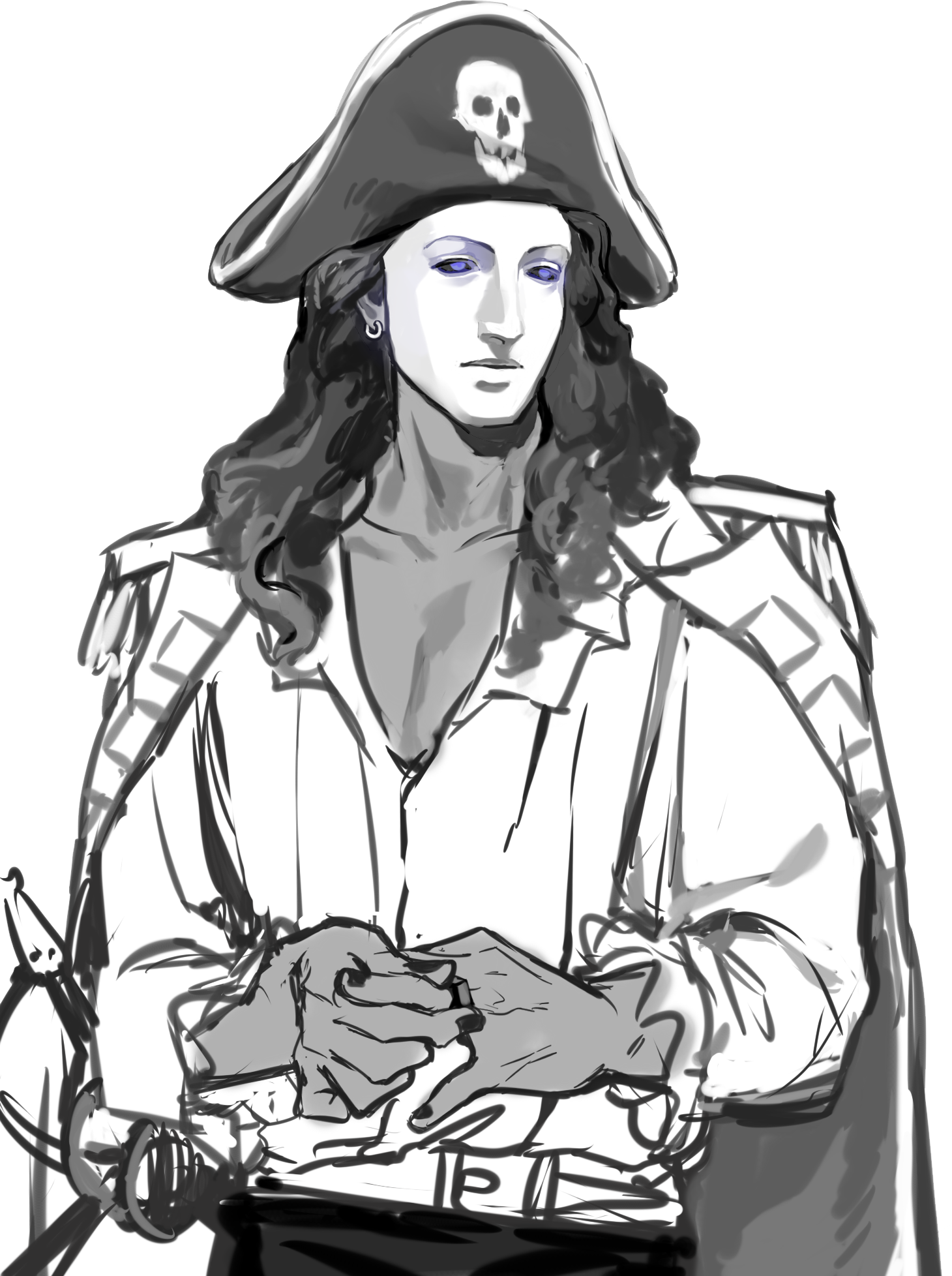 كان يرتدي قبعة مثلثة مبالغ فيها عليها جمجمة بيضاء وريش. كان يرتدي قميصًا أبيض مزينًا بالدانتيل ومعطفًا بنيًا ثقيلًا ورائعًا. كان يتدلى من حزام جلد الثور الذي حمل لباس ضيق أبيض سيف رفيع.