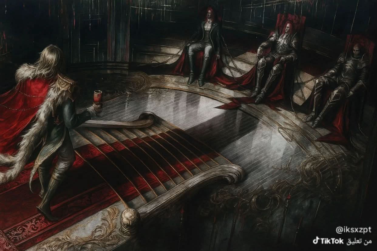 لم يكن مسند الذراع أسود نقي اللون. كانت أنماطه تنضح باللون الأحمر الداكن، كما لو كانت تقاطعًا بين الحديد والدم.